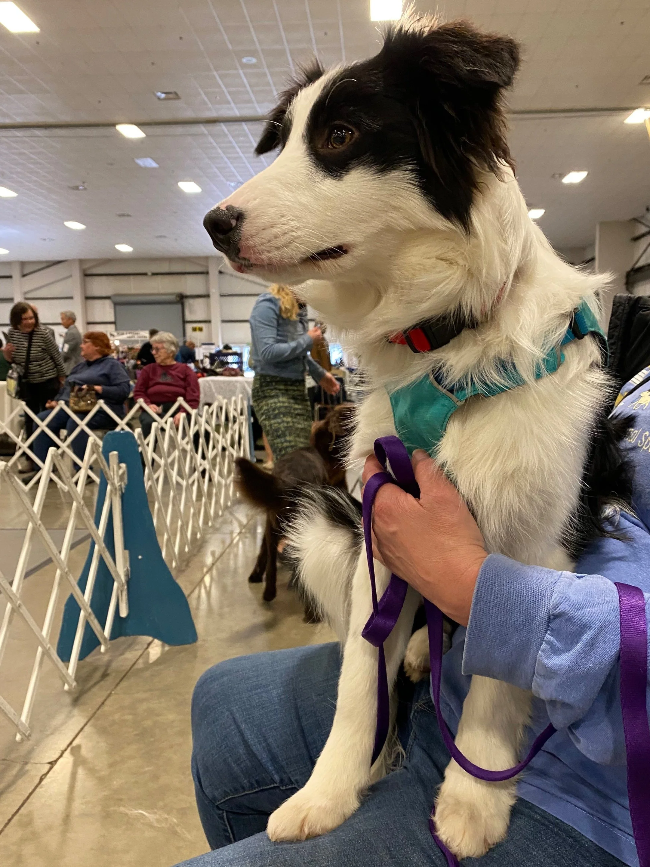 Julia handled hotel life with ease. She went to the door when she needed to go out, rode in the elevator with lots of dogs and people she didn’t know, didn’t have any accidents. She slept quietly in her crate next to my bed each night. Each day during the time I needed to show Leo she slept in the car crate (it was very cool out so I could safely leave her in the car). After Leo was done I then took her into the show for some socializing and she was a champ even without Leo! I knew I couldn’t properly handle both of them in all of that chaos and see to both their needs at once. She IS a snarky little b!tch if someone shoves into her personal space. She snarked at a Flatcoat who surprised her when she was sitting on my lap. She made little ugly faces (subtle quick snarls) anytime she saw another dog eating bait after Rose gave her a taste of what they were getting 😂. She was sure that all treats should be hers. Another person let their PWD stand over her completely ignoring her body language asking for space. So I scooper her up and out of there as I saw her little requests being ignored. I have no doubt she would have snarked at that dog had I not as I saw her eyes going hard. But she was completely comfortable around all the chaos, being among all those dogs and she was happy to meet all sorts of new people. I kept the times in the show buildings short so she didn’t have time to get too over excited or worried. She loved watching the agility dogs and was like a whole new dog watching them run. I have NO doubt after seeing who she was inside the arena that she can handle a trial environment when and if we decide to do that together.