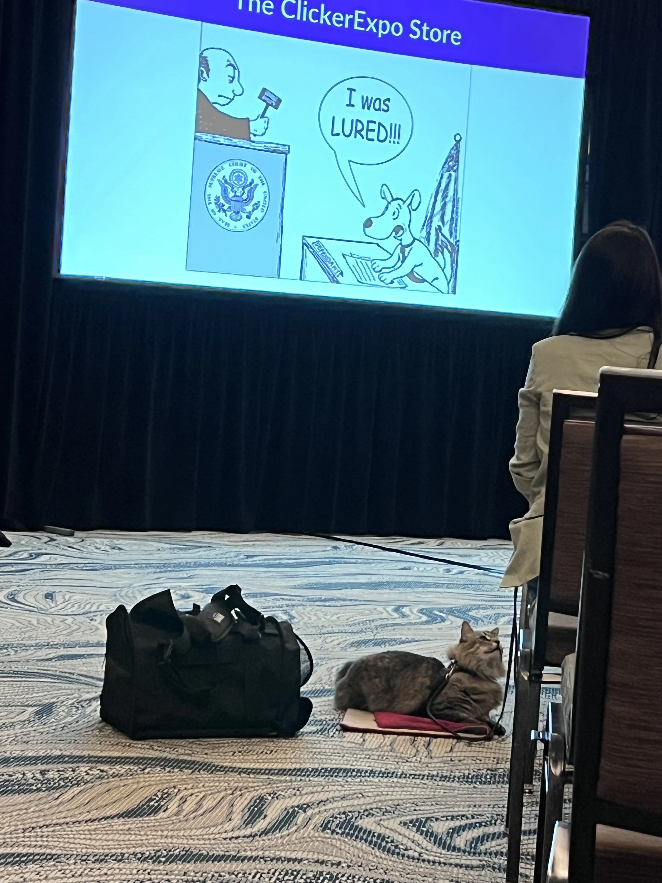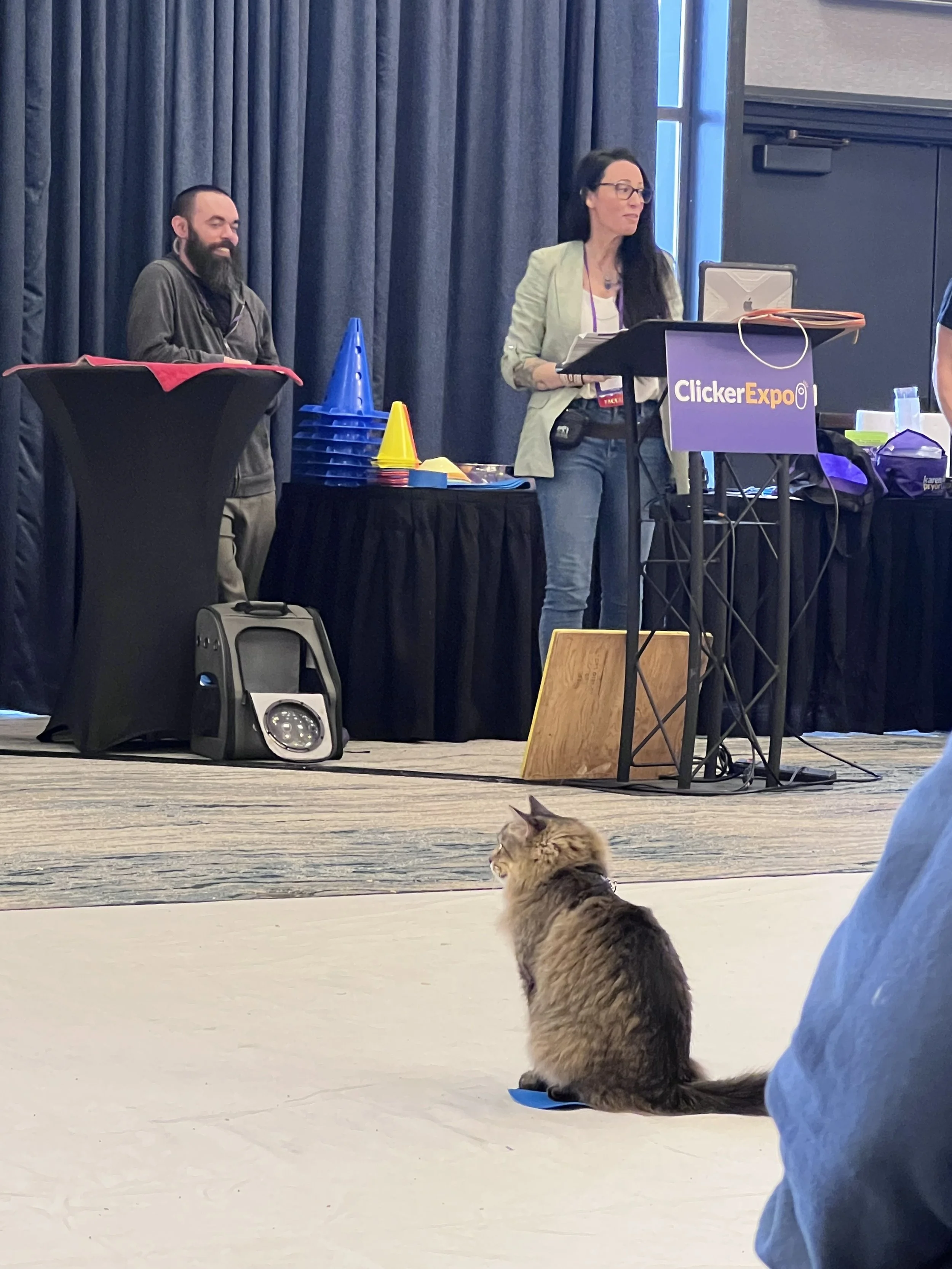 Tonic, the movie star cat demonstrating waiting on his mark. He sat there doing nothing else for over 5 minutes while Melissa Millett spoke and took questions. A lovely example of complete stimulus control for his “mark”. (The podium her helper is leaning on is his start station, his crate the pause station)