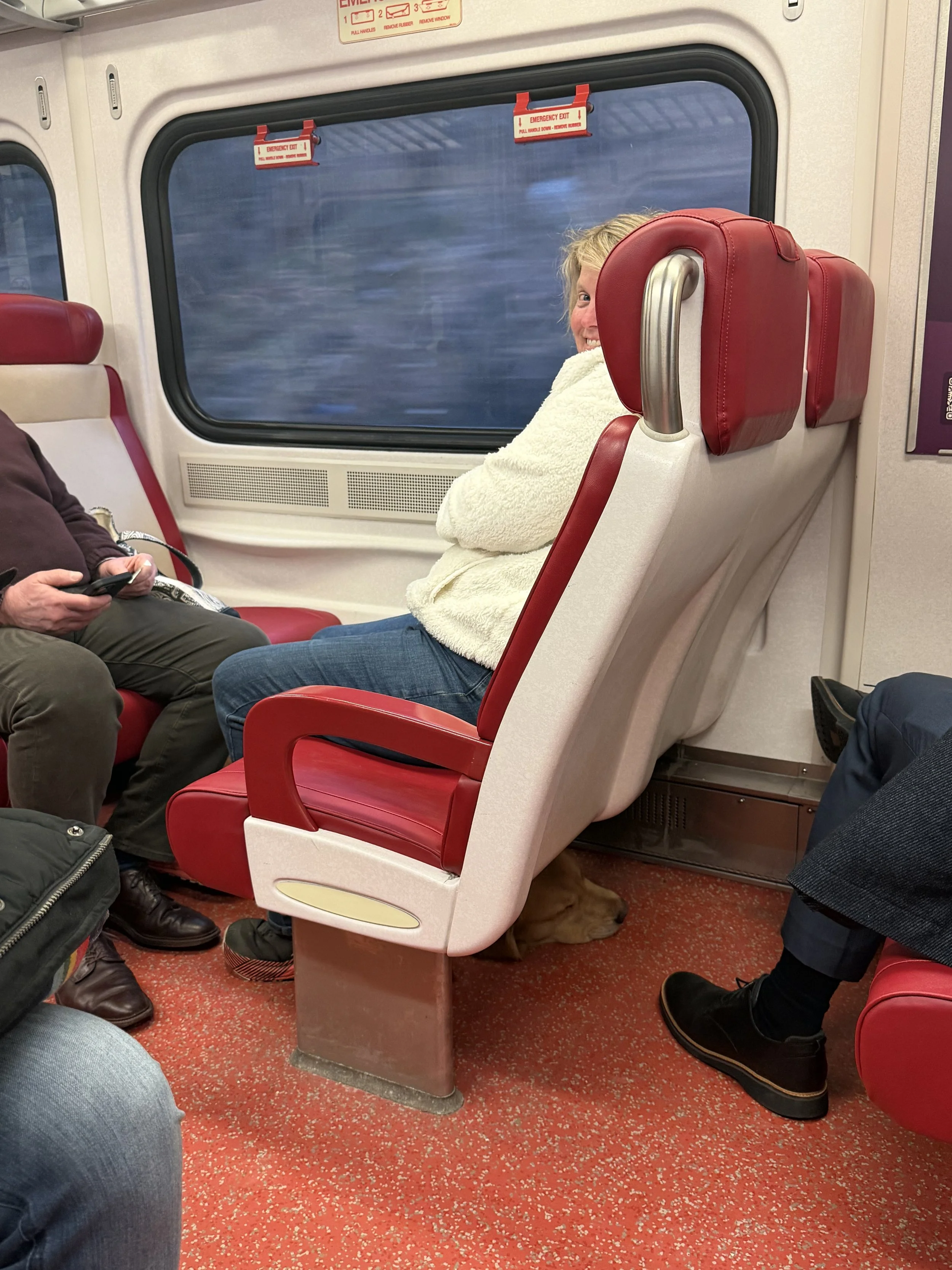 The train was packed for the ride back, Leo was a champ cramming his big self under my seat.